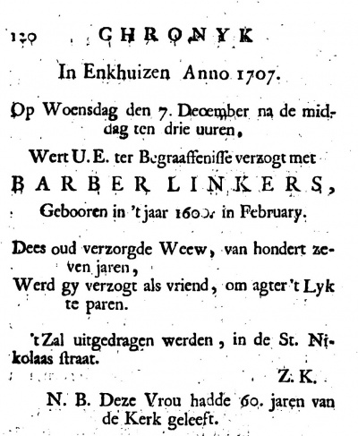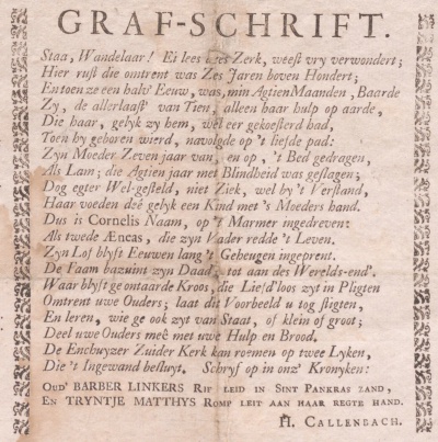 *Staa, Wandelaar ! En lees dees Zerk, weest vry verwondert;<br>Hier rust die omtrent was Zes Jaren boven Hondert;<br>En toen ze een halv' Eeuw, was, min agtien Maanden, Baarde<br>Zy, de allerlaast' van Tien, alleen haar hulp op aarde,<br>Die haar, gelyk zy hem, wel eer gekoesterd had,<br>Toen hy geboren wierd, navolgde op 't liefde pad:<br>Zyn moeder zeven jaren van, en op 't bede gedragen,<br>Als Lam; die Agtien jaar met Blindheid was geslagen;<br>Dog echter Wel-gesteld, niet Ziek, wel by 't Verstand,<br>Haar voeden deê gelyk een Kind met 's Moeders hand.<br>Dus is Cornelis Naam, op 't Marmer ingedreven:<br>Als twede Æneas, die zyn Vader redde 't Leven.<br>Zyn lof blyft Eeuwen lang 't Geheugen ingeprent.<br>De Faam bazuint zyn Daad tot aan des Werelds-end'.<br>Waar blyft ge ontaarde Kroos, die Liefd'loos zyt in Pligten,<br>Omtrent uwe Ouders; laat dit voorbeeld u toch stigten,<br>En leren, wie ge ook zyt van Staat, of klein of groot;<br>Deel uwe ouder meê met uwe Hulp en Brood.<br>De Enchuyzer Zuider Kerk kan roemen op twee Lyken,<br>Die 't Ingewand besluyt. Schryf op in onz' Kronyken.<br>Oud' BARBER LINKERS Rif leid in Sint Pankras zand,<br>En TRYNTJE MATTHYS Romp leit aan haar regte hand.