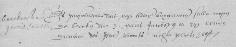 - Vergadering van Vroetschap ende Capiteyne op ten 9 Octobris 1588. Is geresolveert, dat mijn heeren burgermeesteren sullen coopen de boecken, die z(aligher) Gerrit Jacobsz in syn leven dienaer des godel. woorts achtergelaten heeft.