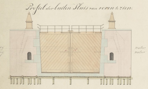 - De oude zee schutsluis bij de Drommedaris werd in in 1827 gebouwd. De eerste steen werd gelegd op 28 mei 1827 door M.C. van der Willige, Burgemeester van Enkhuizen. De naam Sassluis is een zeer ongebruikelijke samenvoeging van sas en sluis aangezien het allebei hetzelfde betekend. Een Sas is dus een sluis en zo had je vroeger ook de Sassenier ofwel de Sluiswachter ! Van de sluis zijn de bouwtekeningen bewaard gebleven waarvan we een uitsnede tonen. Wat we hier zien zijn de gesloten sluisdeuren vanaf de buitenhaven. Aan beide zijden zien we onzichtbaar voor het oog omdat ze onder water zitten twee inlaten in de sluismuur. In deze inlaten zit normaal gesproken een zware schuifdeur die men Rinket noemt, die op hun beurt weer bediend werden door een Rinket lier die er pal boven staan. Tussen de schuifdeur en de Lier zit een tandheugel die bij het bedienen van de schuifdeur omhoog komt. In de binnen sluisdeuren zaten de Rinket deuren in de sluisdeuren, de Rinket lieren stonden op de sluisdeuren. Hiermee kon men al naar gelang het water in of uit de sluis laten lopen. Bij een restauratie van omstreeks 1928 zien we de water inlaten ook van de binnenkant in een droogstaande sluis. De sluis bevatte 8 sluisdeuren ( eb en vloed deuren ) die werden geopend en gesloten door het identieke getal van Kaapstanders.