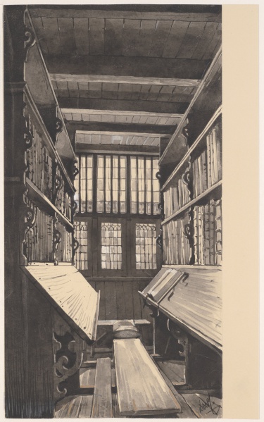 - Interieur van de 17de-eeuwse bibliotheek 1 interieurtek.: penseel in O.I. inkt, en bruin, gehoogd met dekwit; 342 x 180 mm. r.o.: D d V L 341 x 177 mm, Vries Lam, D. de, Noord-Hollands Archief / Provinciale Atlas - Prenten en Tekeningen, NL-HlmNHA_359_001043_K