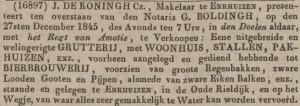 • 24 december 1845 : J. de Koningh Cz. , Makelaar te Enkhuizen, presenteert ten overstaan van den Notaris G. Boldingh, op den 27sten December 1845, des Avonds ten 7 Ure, in den Doelen aldaar, met het Regt van Amotie, te Verkoopen : Eene uitgebreide en welingerigte Grutterij, met woonhuis, stallen, Pakhuizen, enz., voorheen aangelegd en gediend hebbende tot Bierbrouwerij, voorzien van groote Regenbakken, Zware Looden Gooten en Pijpen, alsmede van zware Eiken Balken, enz., staande en gelegen te Enkhuizen, in de Oude Rietdijk, en op het Wegje, van waar alles zeer gemakkelijk te Water kan worden vervoerd.