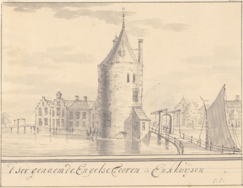 - 1396 : Historie der vermaerde zee en koopstadt Enkhuisen, blz. 14 ; Ook wil men hier dat ontrent dien tijdt den Engelschen toorn, soo genaemt naer d'Engelschen, die sich toen in 's Graven dienst lieten gebruiken, van witten steen uit het water sij opgehaelt. Dit wierdt een weerbaere sterkte, boven met schietgaeten versien. Andre stellen dat 't bouwen deses toorns elf jaeren laeter.