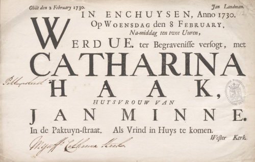 - 8 februari 1730 : Begraven in graf WK 379 M van de Westerkerk te Enkhuizen.