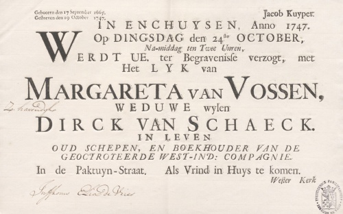- 24 oktober 1747 : Begraven in graf WK 484 M de Westerkerk te Enkhuizen.