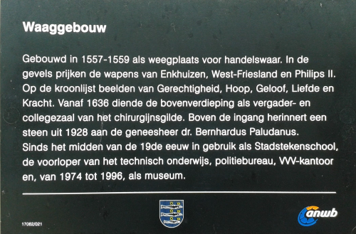 Waaggebouw : Gebouwd in 1557 - 1559 als weegplaats voor handelswaar. In de gevels prijken de wapens van Enkhuizen, West-Friesland en Philips II. Op de kroonlijst beelden van Gerechtigheid, Hoop, Geloof, Liefde en Kracht. Vanaf 1638 diende de bovenverdieping als vergader- en collegezaal van het chirurgijnsgilde. Boven de ingang herinnert een steen uit 1928 aan de geneesheer dr. Bernhardus Paludanus. Sinds het midden van de 19de eeuw in gebruik als Stadstekenschool, de voorloper van het technisch onderwijs, politiebureau, VVV-kantoor en, van 1974 tot 1996, als museum.